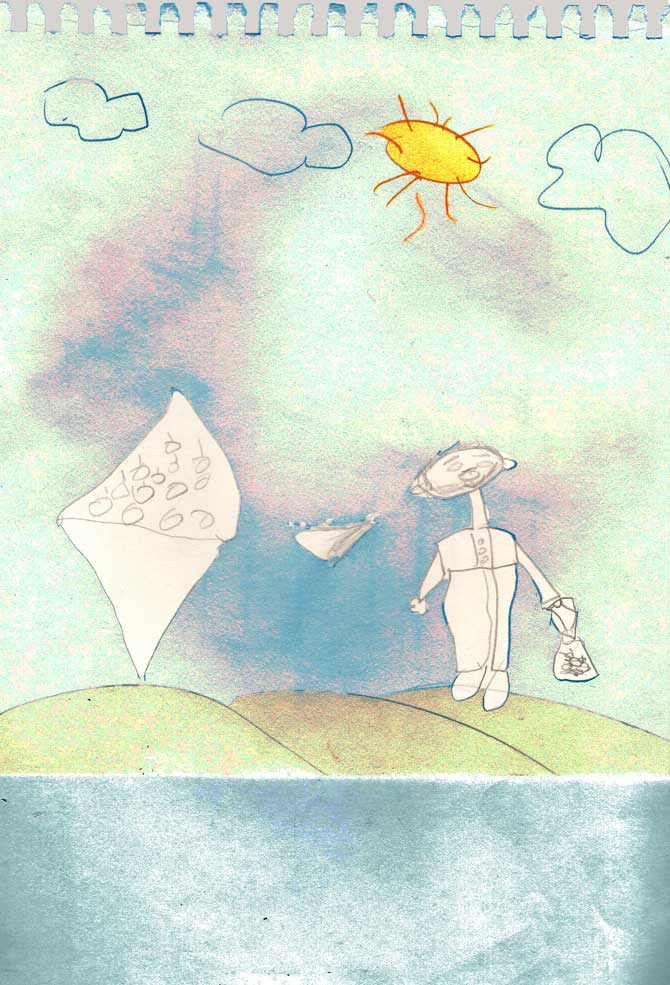 کنار خیابان نشسته بودم. ﻣﻰخواستم طراحی کنم. یک بچهﻯ فالﻓﺮوش آمد. فال ﻧﻤﻰﺧﻮاستم. نسبت به وسایل طراحی کنجکاو شده بود. ابراز علاقه ﻣﻰکرد. یک نقاشی از دفترم کندم و هدیه دادم به او. خوشحال بود:). اسم خودش و برادرش را روی نقاشی نوشت. کمی از خودش گفت، که ((انگشتش بریده بود و کلی خون اومده بود)) اما شکر خدا خونش بند آمده بود:). از بچهﻯ دستﻓﺮوشی که ((تو میدون خراسون تصادف کرده بود و ...)):(. ابراز نگرانی کردم. گفت بردنش بیمارستان. از حالش پرسیدم، خبر نداشت. دفتر و مدادم را به او دادم و درخواست کردم من را بکشد؛ و او این گونه هنرنمایی کرد.